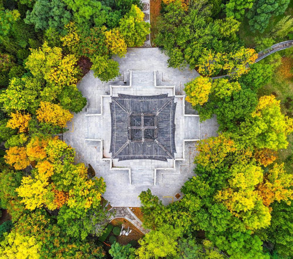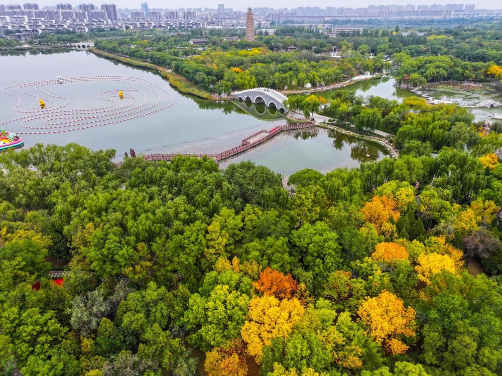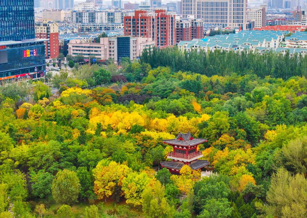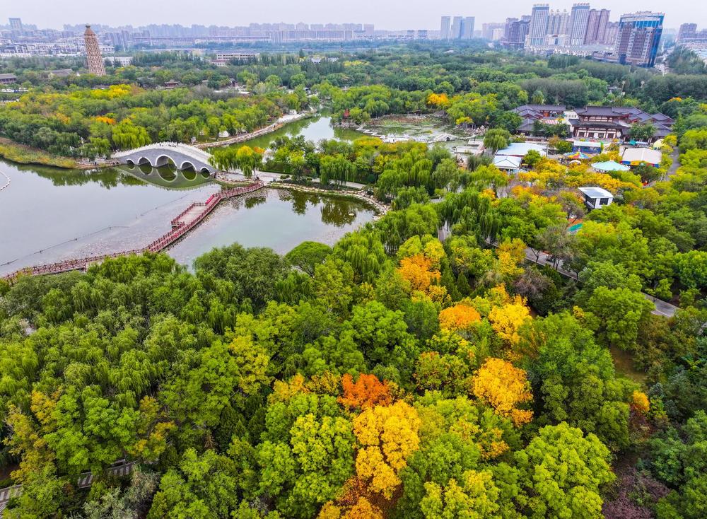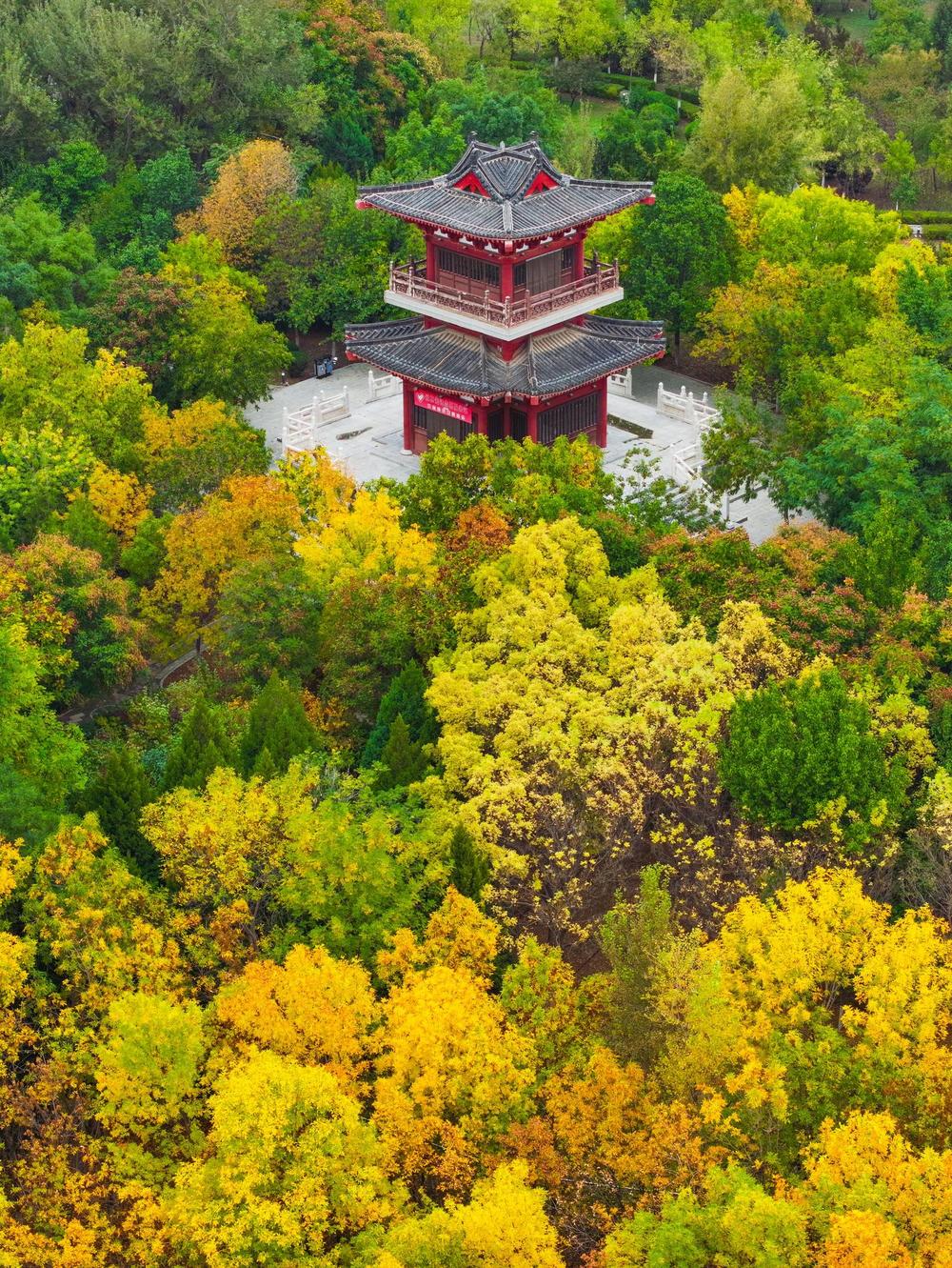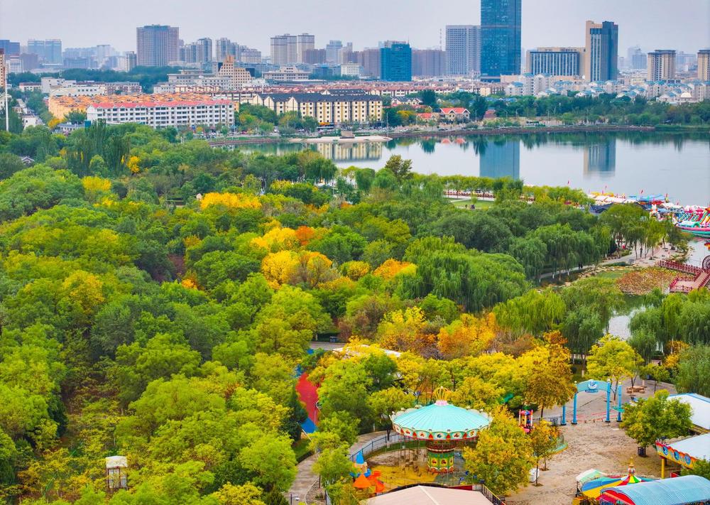 10月9日,从无人机视角俯瞰宁夏银川海宝公园,仿佛走进了梦幻般的秋日童话世界。