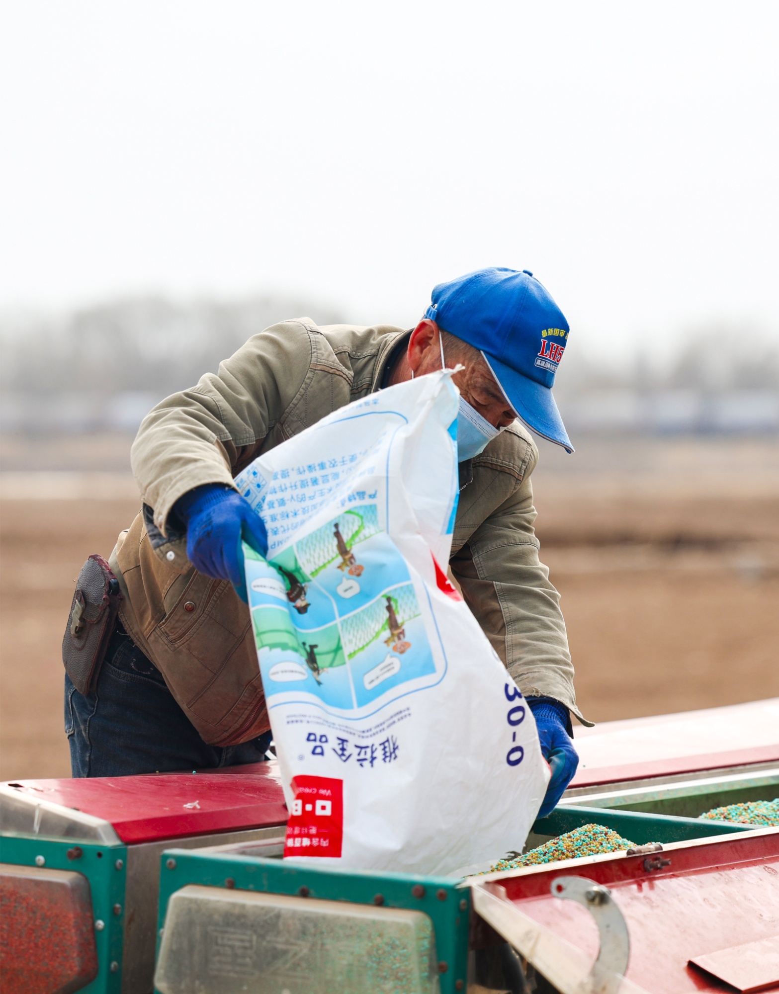 千亩方里,种植户正在给种肥一体机添加肥料。