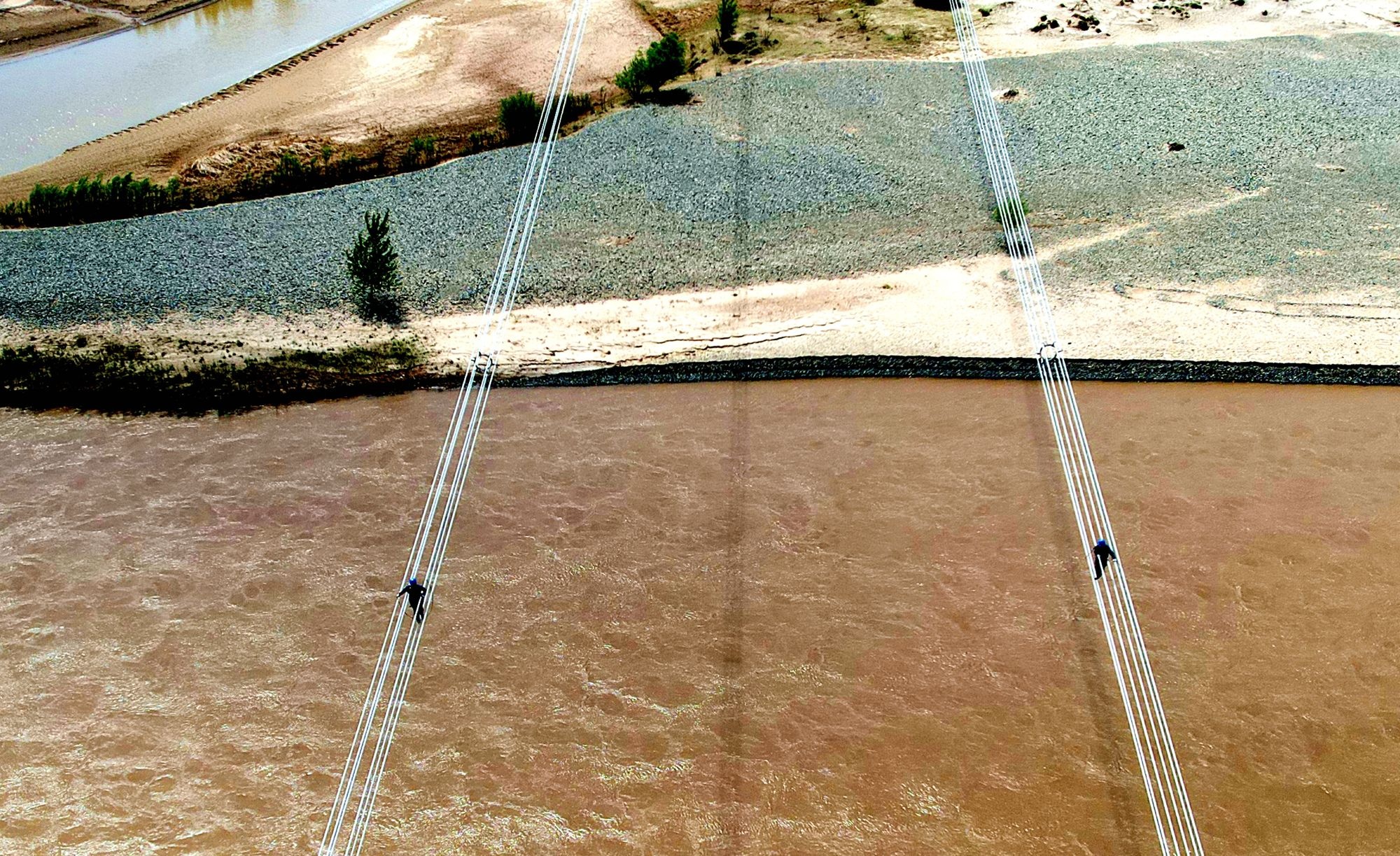 宁夏中卫市沙坡头区,国网宁夏电力检修人员对“宁电入湘”特高压工程宁夏段跨黄河线路进行走线验收