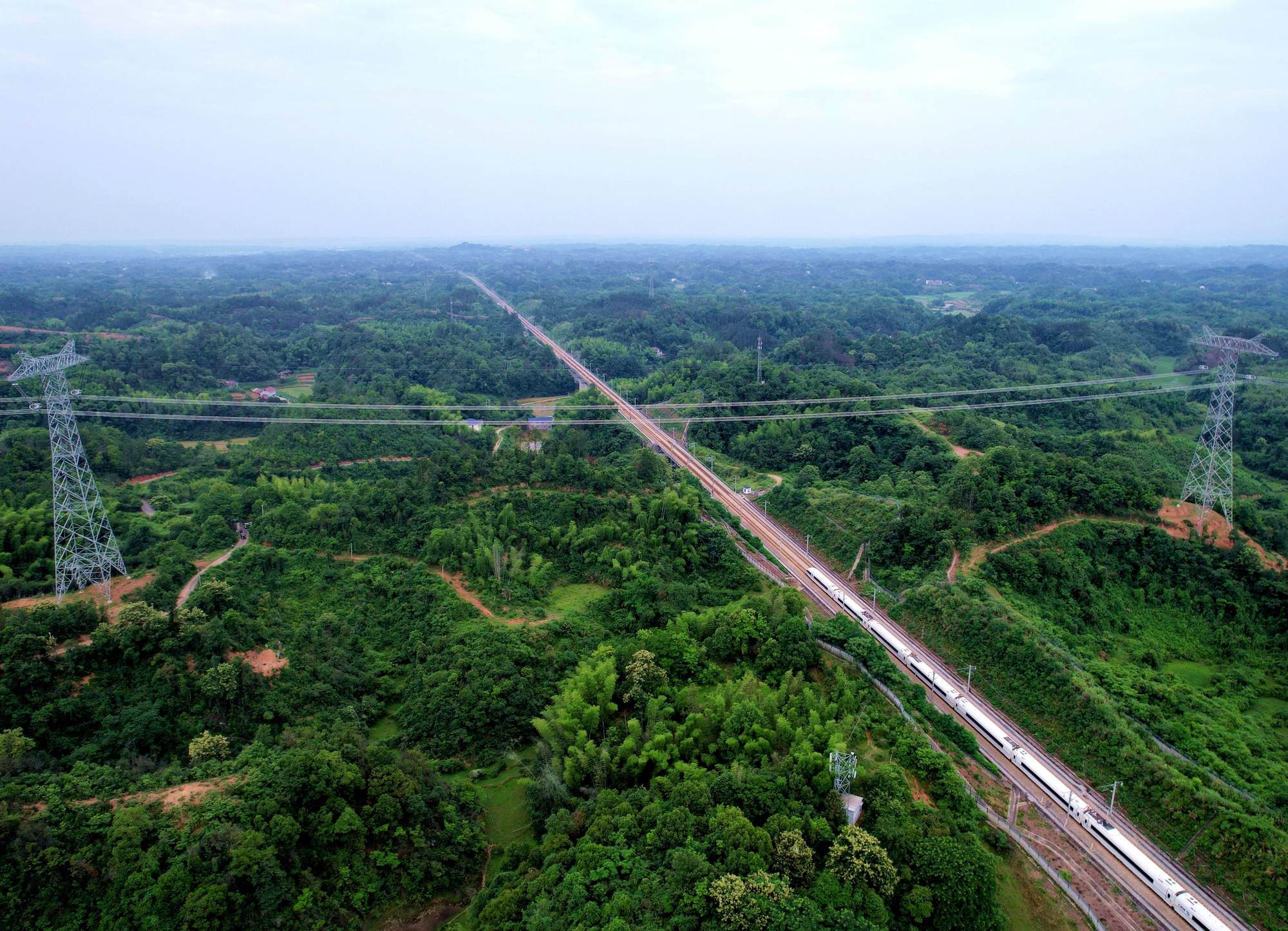 湖南省常德市桃源县境内,一列高速列车穿过“宁电入湘”工程湖南段